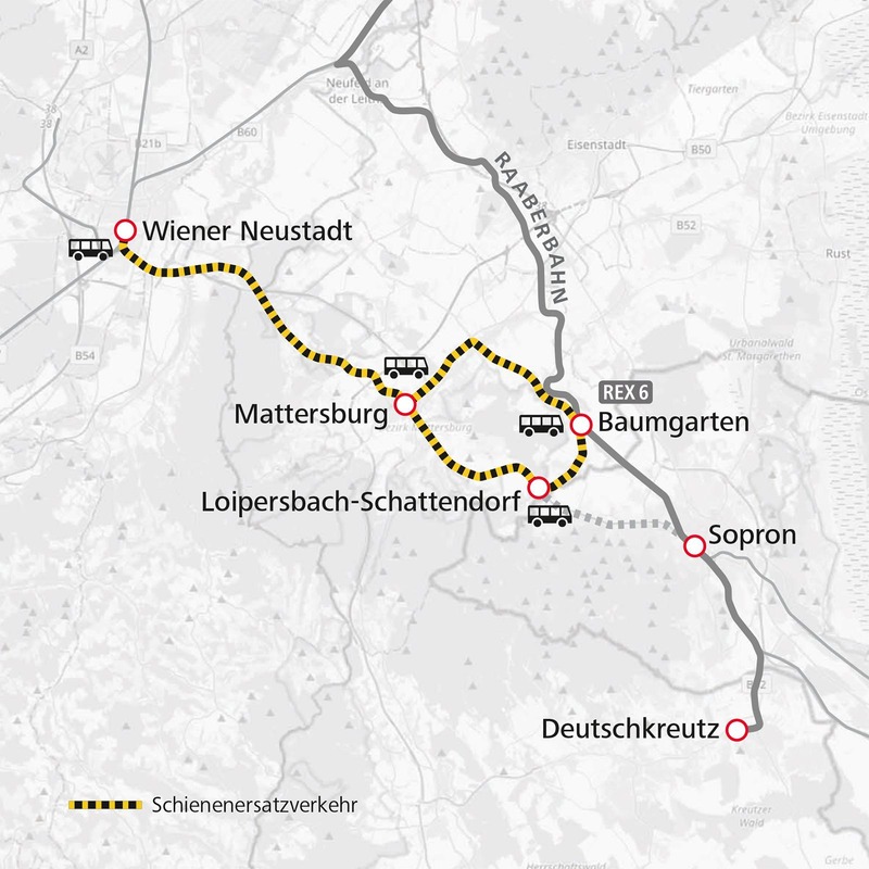 Als Ersatz richten wir einen Schienenersatzverkehr mit Bussen ein. Für Reisende von/nach Sopron und Deutschkreutz fährt der Schienenersatzverkehr über den Bahnhof Baumgarten an. Hier besteht die Möglichkeit des Umstiegs vom/zum REX6 der Raaberbahn. Katzelsdorf kann aufgrund einer Straßensperre nicht angefahren werden.
