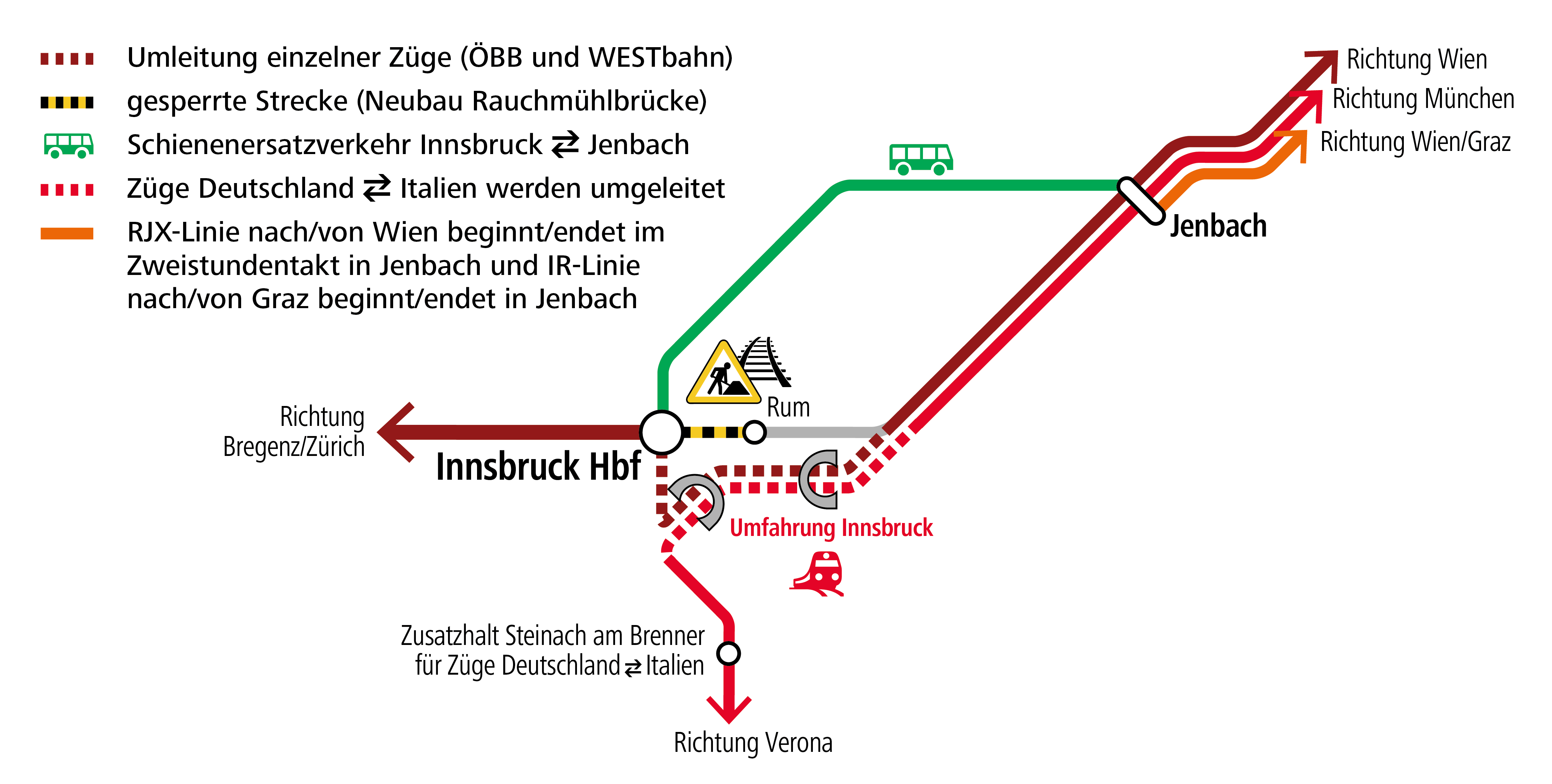 - Für die RJX-Züge Wien - Zürich fährt zwischen Innsbruck und Jenbach ein Schienenersatzverkehr mit Bussen. Dies bedeutet allerdings eine Fahrzeitverlängerung von rund einer Stunde.