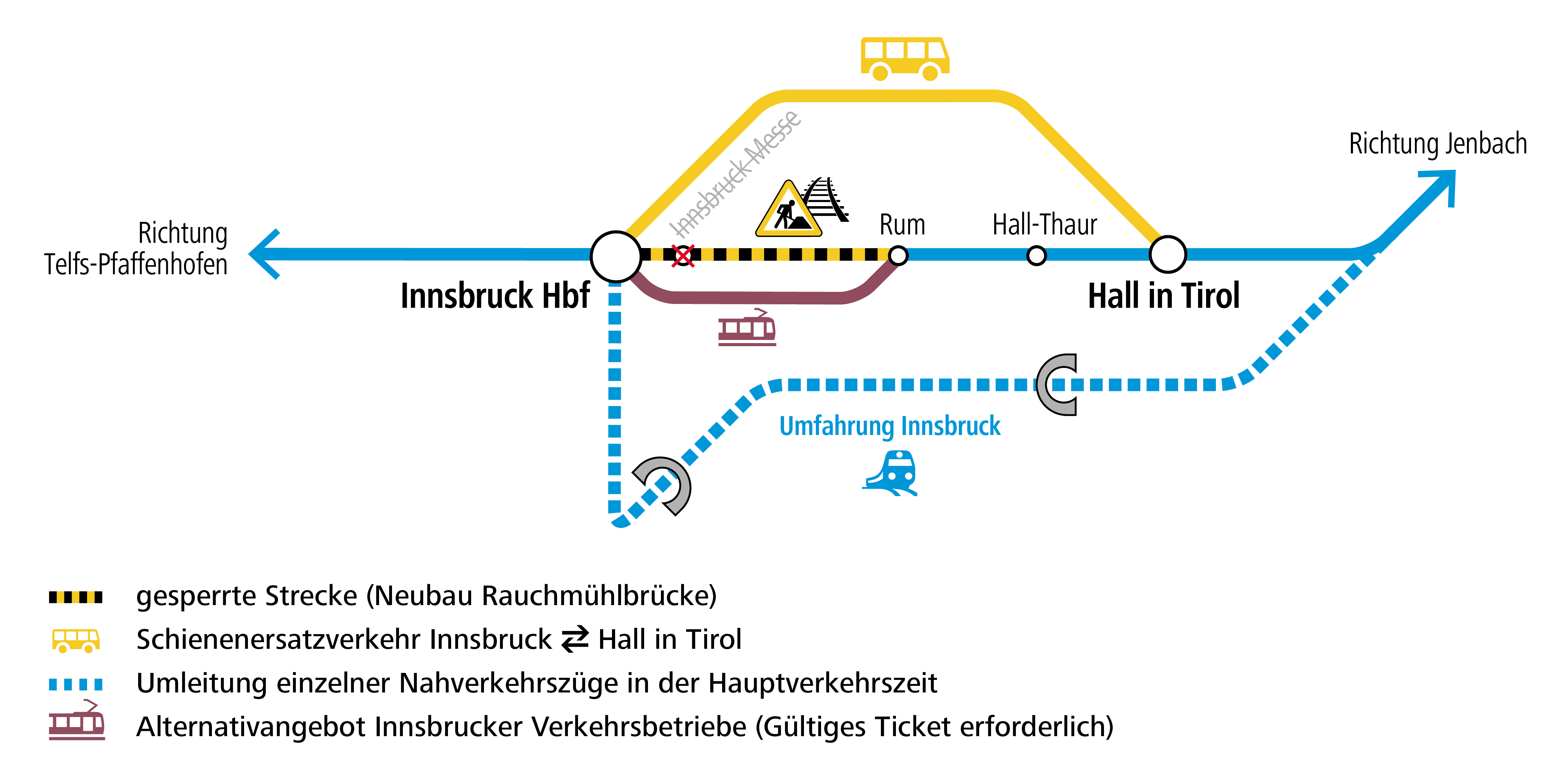 - Zwischen Jenbach und Innsbruck fahren stündlich Direktbusse im SEV.